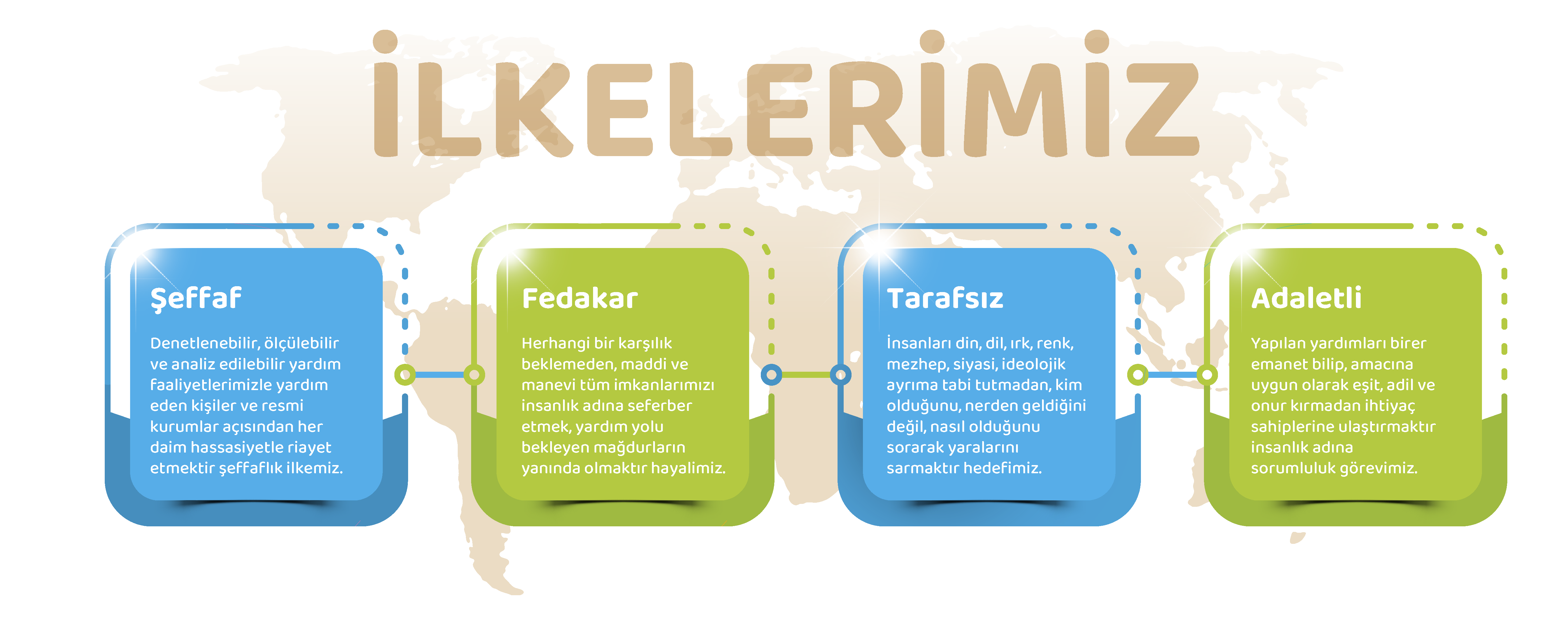 Amacımız; dünyanın farklı coğrafyalarında din, dil, ırk, renk, mezhep ayrımı yapmaksızın ihtiyaç sahiplerine yardım ve desteklerinizi ulaştırmaktır. Takdir beklemeden, insanlığın evrensel değerlerinin korunmasına yönelik güzel işlere imza atmaktır.